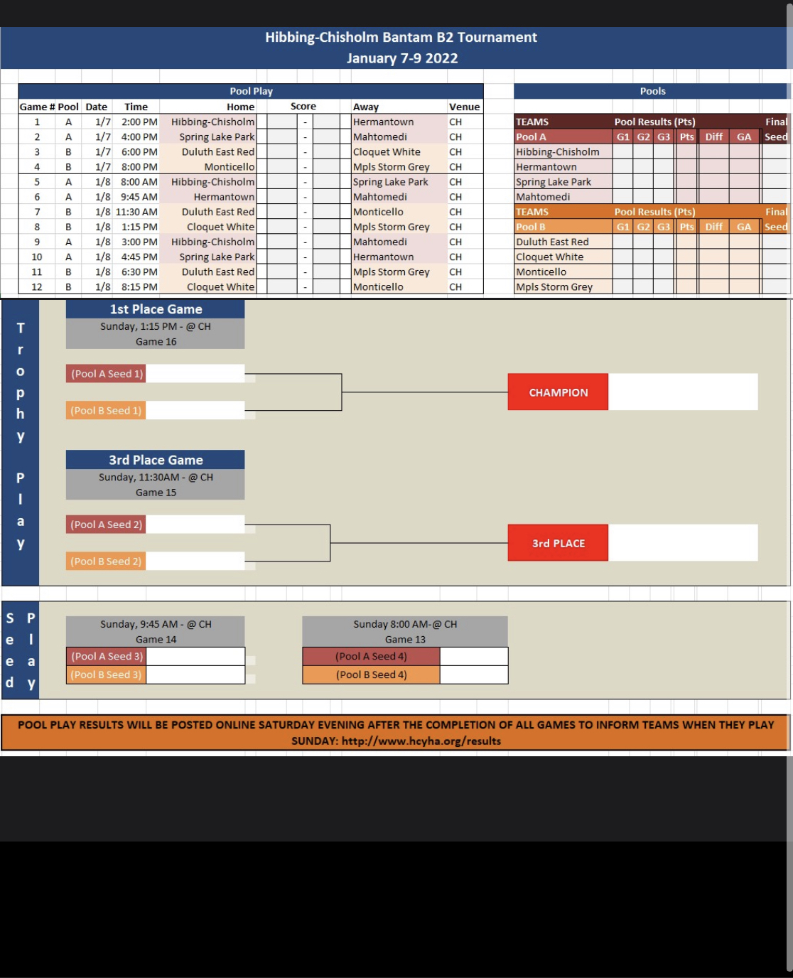| Sat Jan 15 | Eveleth | Pine Valley Arena | 8:30 AM | Preteau | Linder | Bertin | N/A |